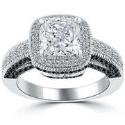 This ravishing diamond engagement ring is designed with lavish vintage style detailing. The dazzling 2.06ctw cushion cut center diamond is secured in a prong setting. Set along this unique mounting are 1.45ctw of white and fancy black round brilliant side diamonds. The cushion cut center diamond is surrounded by a pave halo of round brilliant white diamonds. This one of a kind diamond engagement ring is made in 14k white and black gold.