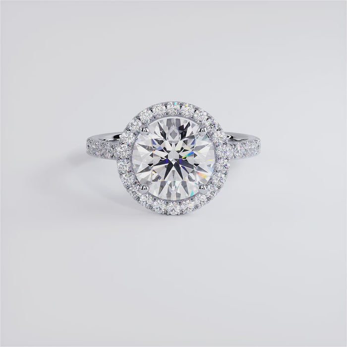 A petite halo micropavé diamond engagement ring set with a 3 carat round cut lab grown diamond.