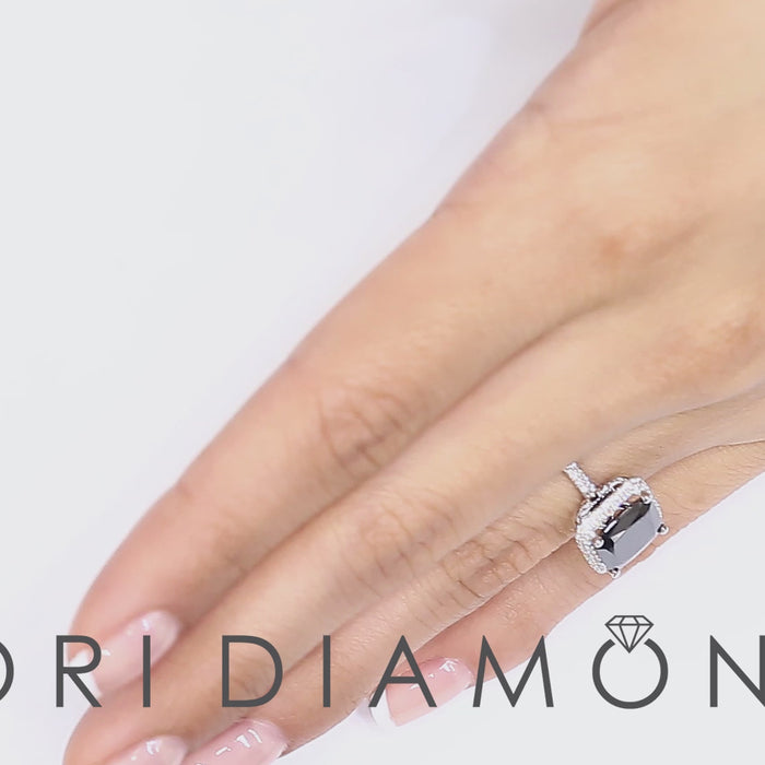 This simple and chic black diamond engagement ring is perfect for a woman that wants to add some sass to a traditional style. An enchanting 3.15 ctw cushion cut black diamond is secured in the vintage inspired setting by 4 strong prongs. 0.82 ctw of white F-VS round diamonds form a glittery halo around the black center diamond, and travel onto the elegant band in a single line. Stunningly crafted in 18k white gold, this diamond engagement ring is sure to be a gift that will be treasured forever.