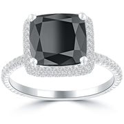 3.97 Carat Cushion Cut Black Diamond Engagement Ring 18k White Gold Pave Halo