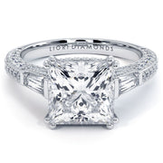 This ring was made by love to tell your love story. A powerful presence of 2.86 ctw princess cut centered with an additional 1.10 ctw of sparklers (baguette and diamond accents) sitting on a elegant 18k white gold micro pave setting. A fairy tale ring to mark your happily ever after.