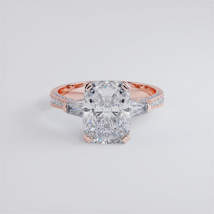 A tapered baguette & round brilliant micropavé diamond engagement ring set with a 3 Carat rectangular cushion cut lab grown diamond.