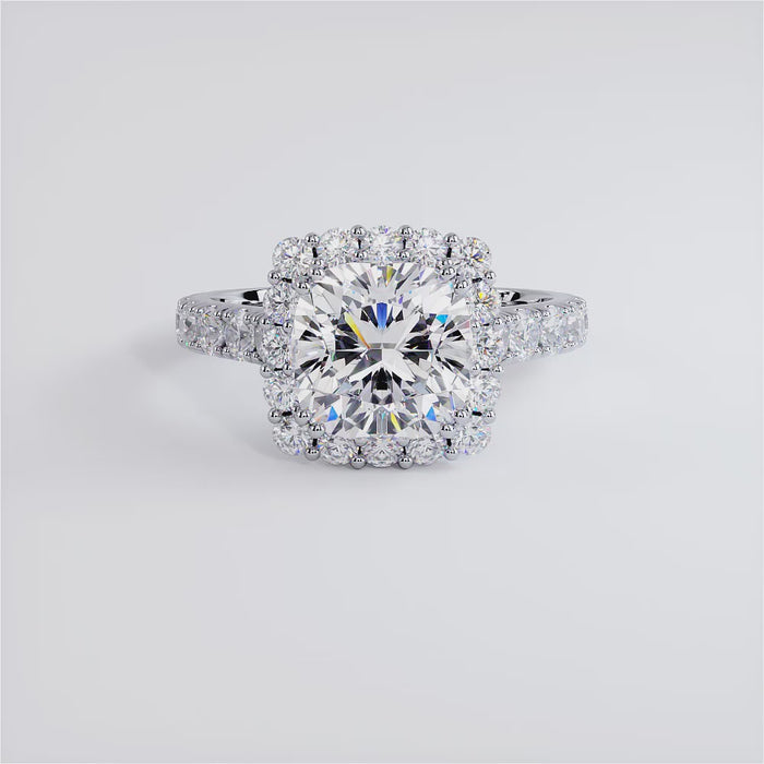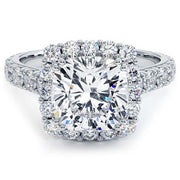 A vintage style micro prong set halo diamond engagement ring set with 3.00ct dew Cushion Cut VVS & Colorless (D-E-F) Moissanite.