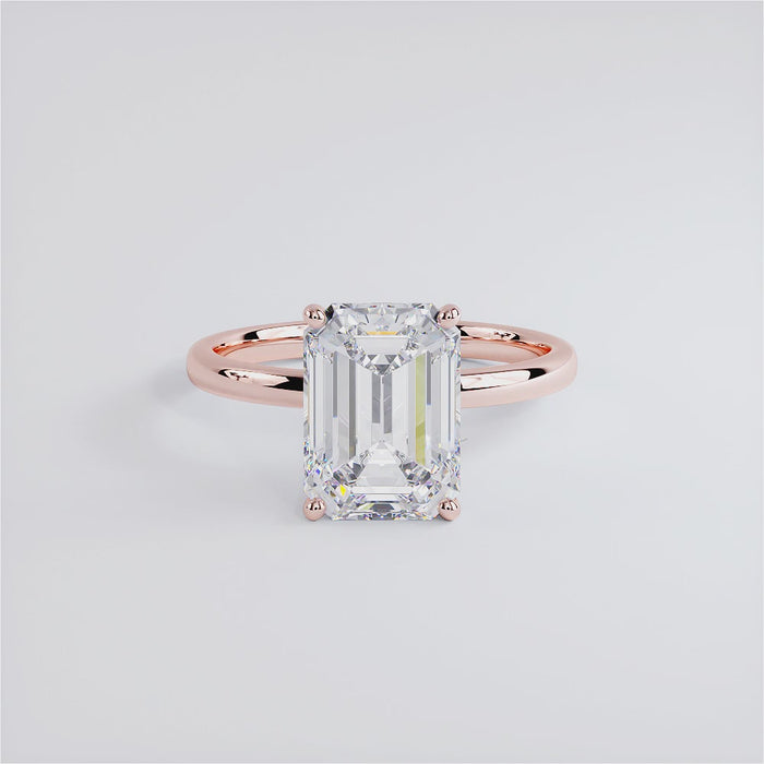 A classic petite wire diamond solitaire engagement ring set with 3 Carat Emerald Cut Lab Grown Diamond.