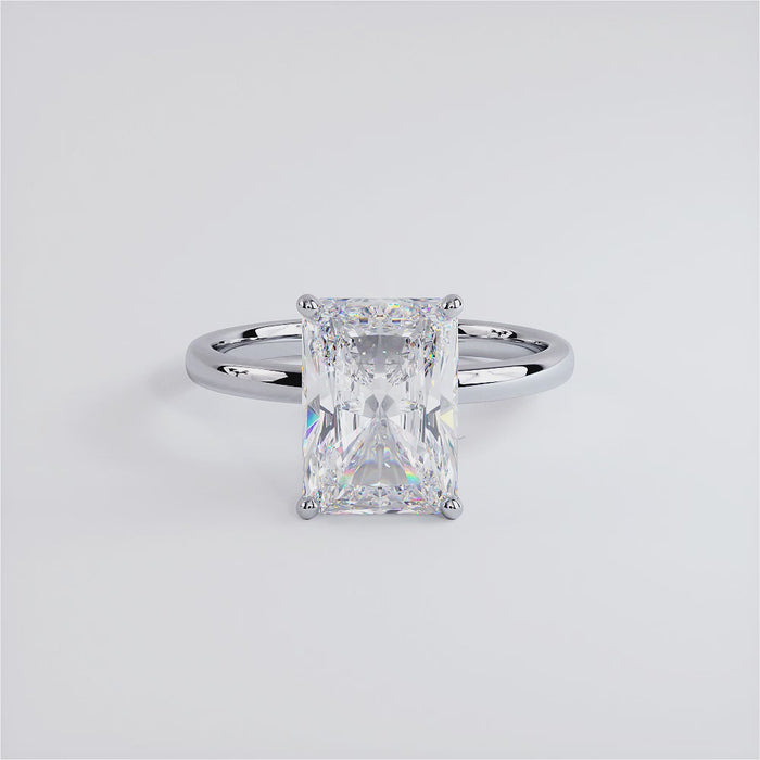 A classic petite wire diamond solitaire engagement ring set with 3 Carat Radiant Cut Lab Grown Diamond.