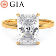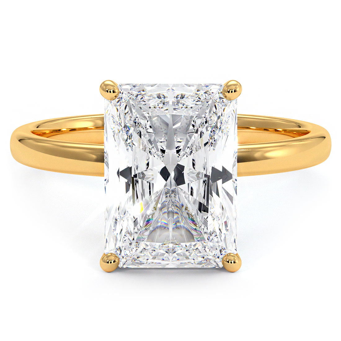 A classic petite wire diamond solitaire engagement ring set with 3 Carat Radiant Cut Lab Grown Diamond.