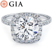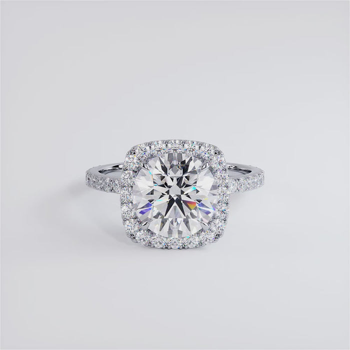 A high set squarish halo engagement ring set with 3.00 Carat Round Cut Lab Grown Diamond.