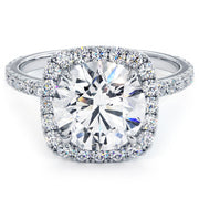 A high set squarish halo engagement ring set with 3.00ct dew Round Cut VVS & Colorless (D-E-F) Moissanite.
