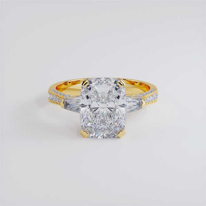 A tapered baguette micropavé diamond engagement ring set with a 4 Carat rectangular cushion cut lab grown diamond.