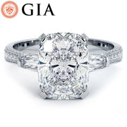 5.09ctw GIA Certified Cushion Cut & Tapered Baguette Three Stone Micropavé Lab Grown Diamond Engagement Ring set in Platinum
