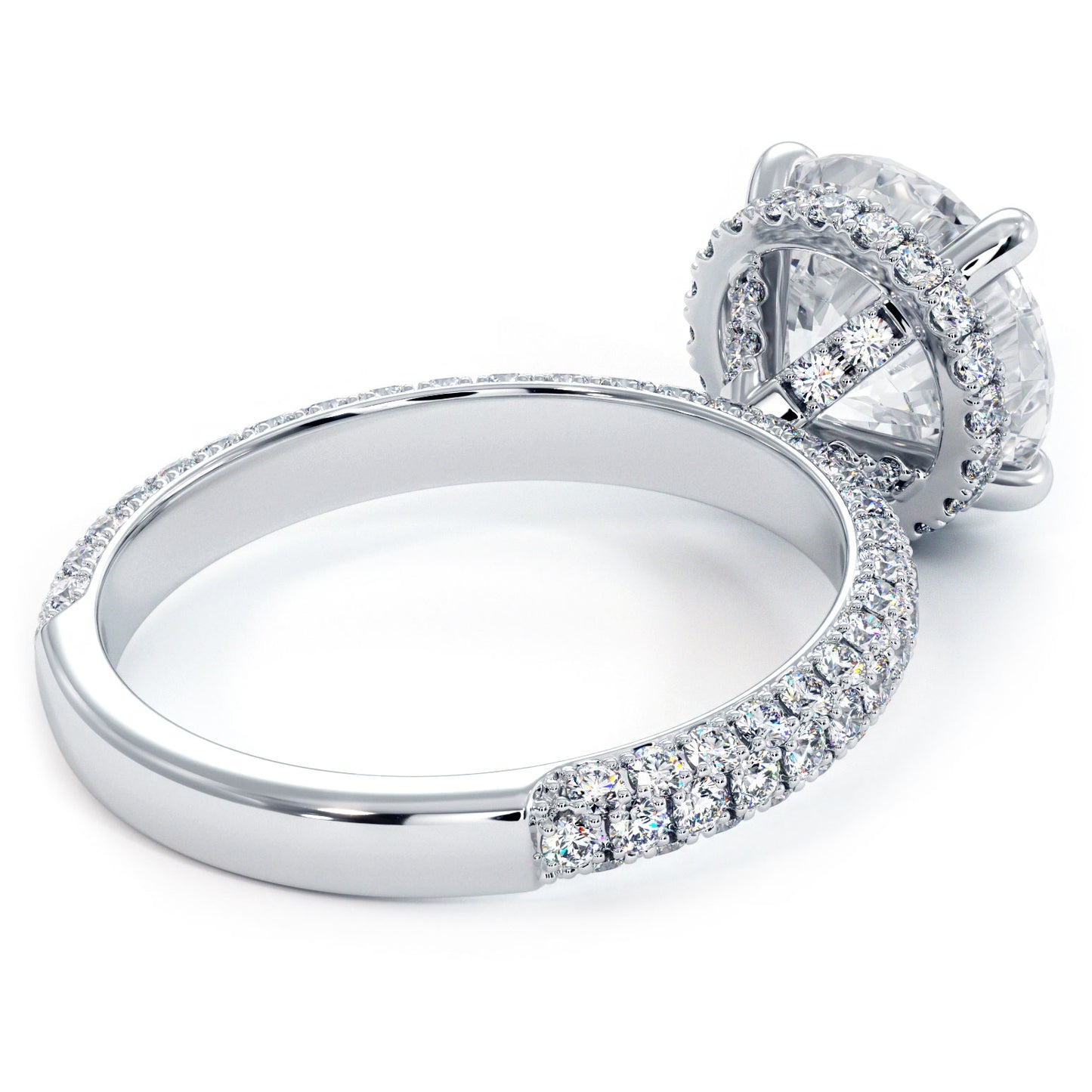 A classic under halo trio micropave diamond solitaire engagement ring set with a 3 Carat Round Cut Lab Grown Diamond, securely held in place by four sturdy prongs.