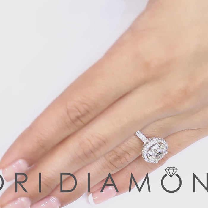 This dazzling diamond engagement holds a 2.77 ctw G-SI2 round brilliant center diamond. 1.25 ctw of F-VS brilliant round diamonds are used as the side stones of this ring. Two rows of diamonds are set along the band in a micro pave setting. More round diamonds are set around the center stone in a diamond pave halo design, adding even more sparkle. . This diamond engagement ring is set in luxurious platinum, and would make a bride to be ecstatic!