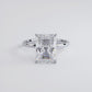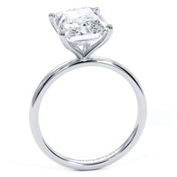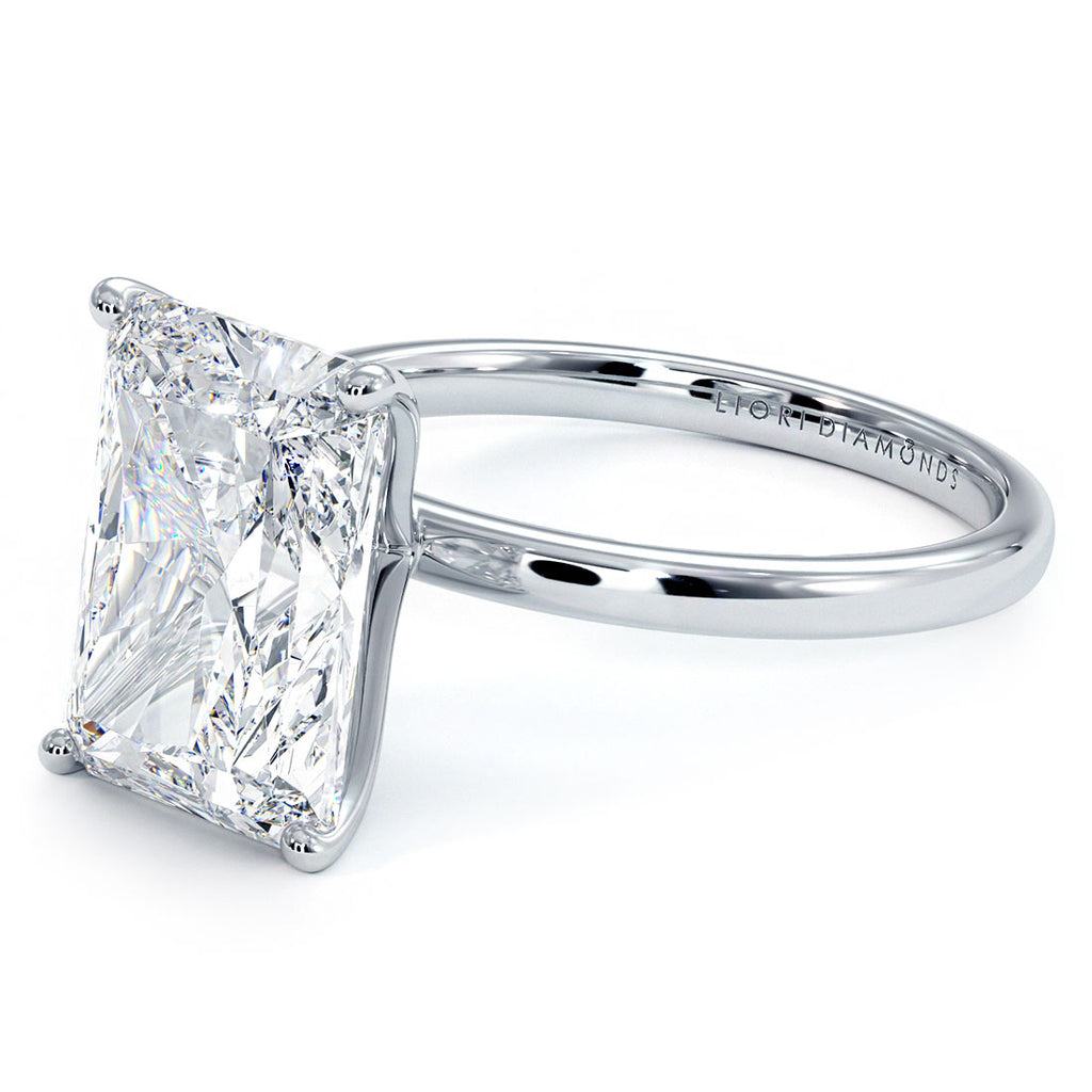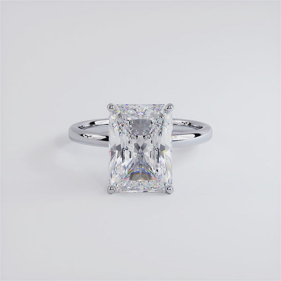 A classic petite wire diamond solitaire engagement ring set with 4 Carat Radiant Cut Lab Grown Diamond.