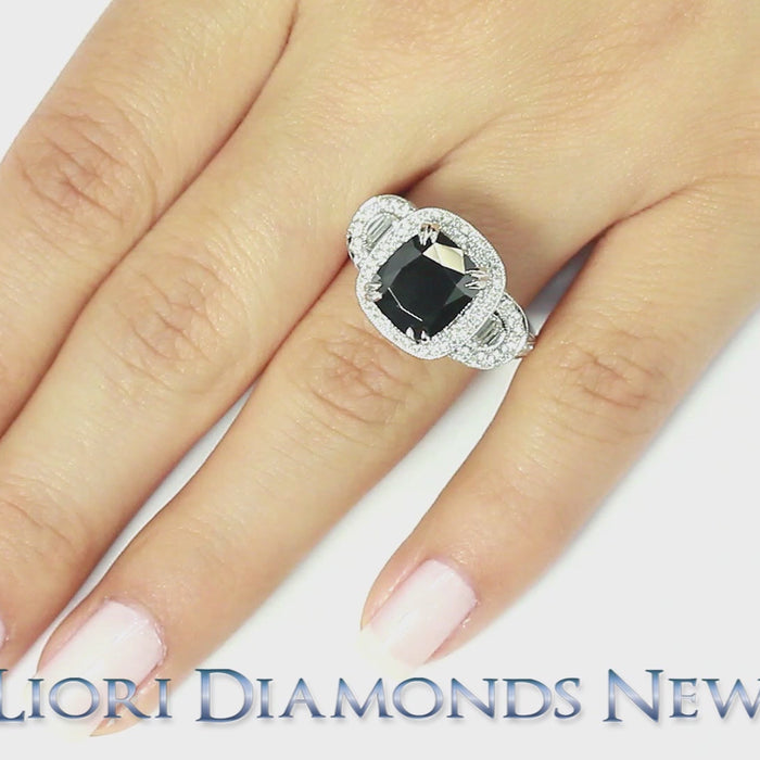 This Vintage Style Black Diamond Engagement ring is set with a 3.39 ctw AAA cushion cut black center diamond. The side diamonds consist of both baguettes and round brilliants adding up to a total of 1.14 ctw F-VS micro pave diamonds. The cushion cut center stone is surrounded by a fiery, lustrous diamond halo. The baguettes set on either side of the center stone add beauty and charm to this gorgeous ring. Slightly smaller round micro pave diamonds surround each baguette in a semi-circle. This Vintage Style Black Diamond ring is made in 14kt white gold.