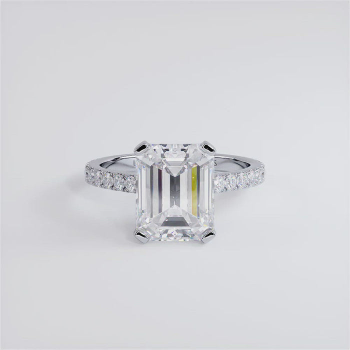A petite micro prong set diamond engagement ring set with 4.00 Carat Emerald Cut Lab Grown Diamond.