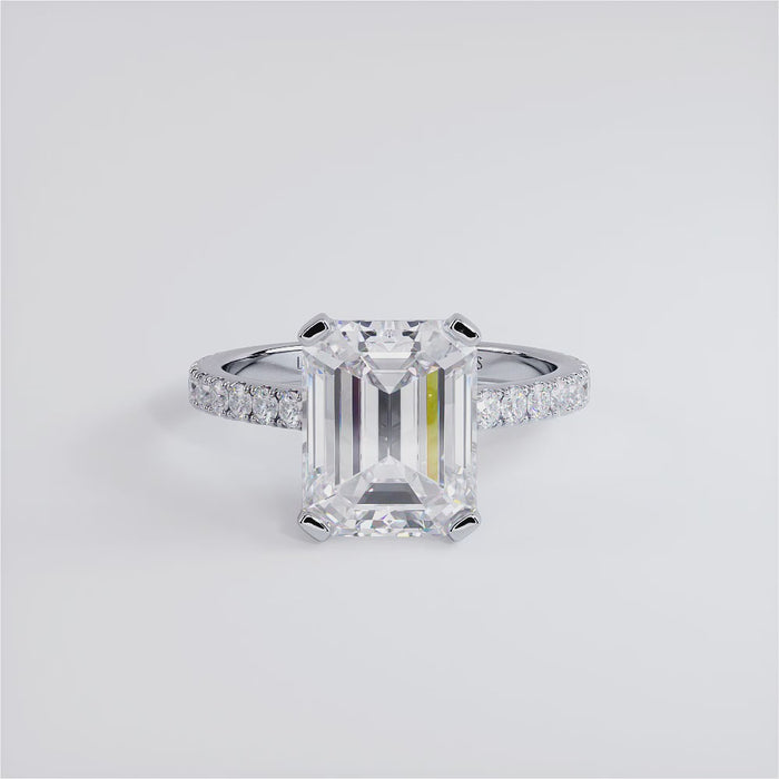 A petite micro prong set diamond engagement ring set with 4.00ct dew Emerald Cut VVS & Colorless (D-E-F) Moissanite.