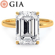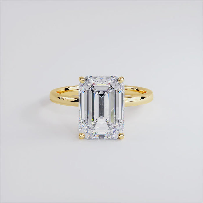 A classic petite wire diamond solitaire engagement ring set with 4 Carat Emerald Cut Lab Grown Diamond.