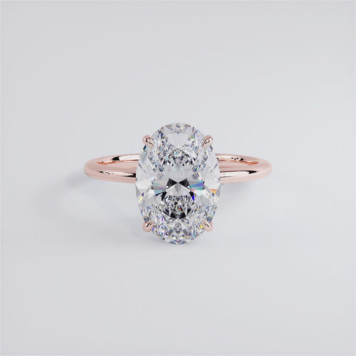 A classic petite wire basket diamond solitaire engagement ring set with 4 Carat Oval Cut Lab Grown Diamond.