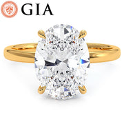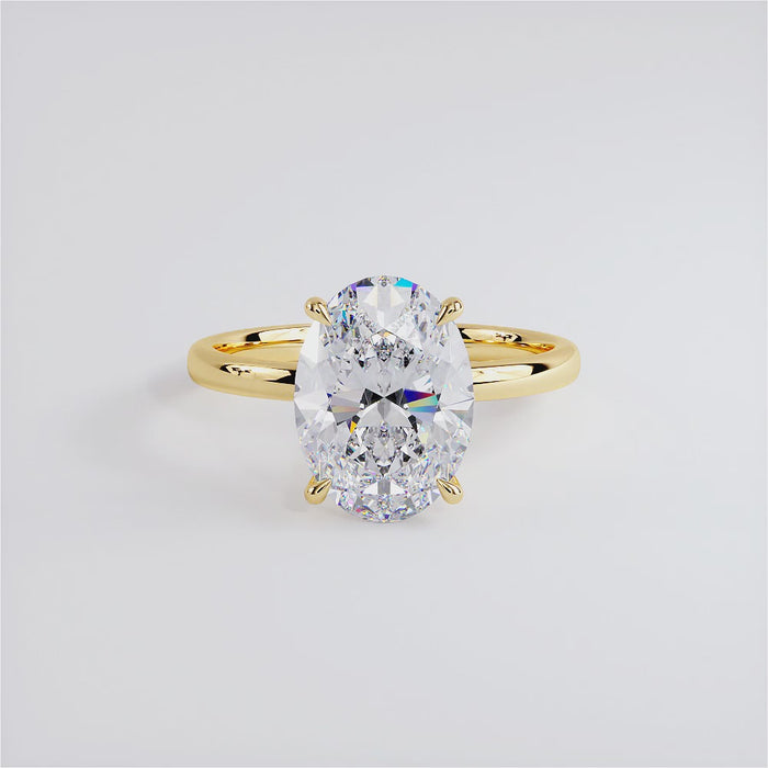 A classic petite wire diamond solitaire engagement ring set with 4 Carat Oval Cut Lab Grown Diamond.