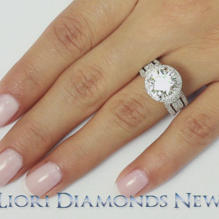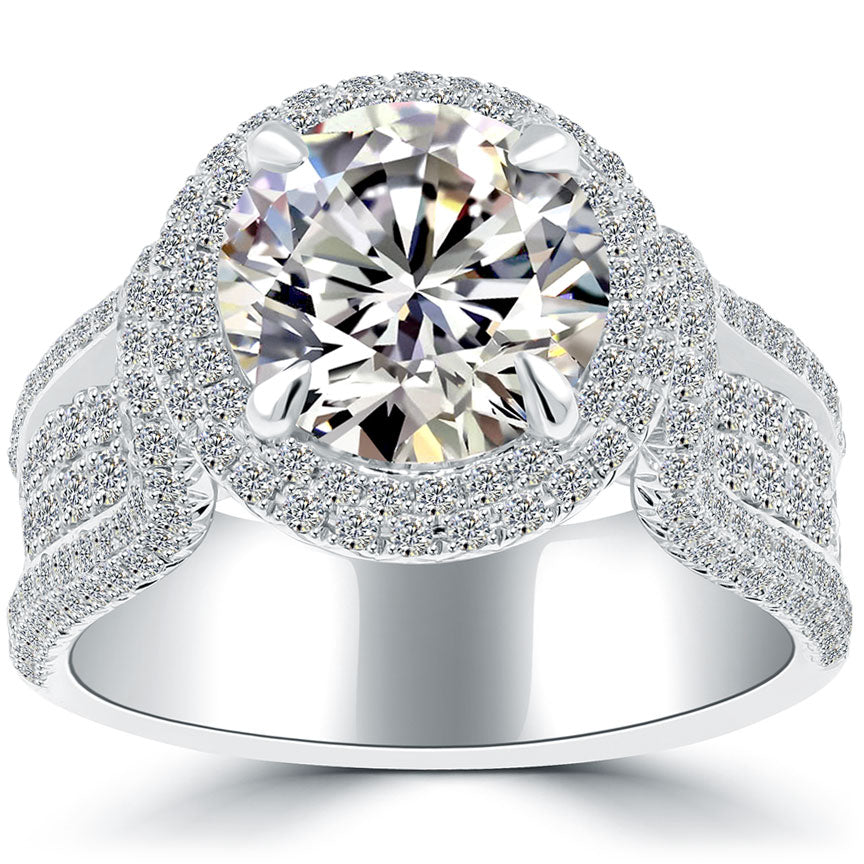 This stylish diamond engagement ring is beautifully set with a large 3.01 ctw round brilliant center diamond. 2.01 ctw of F-VS round brilliant diamonds are set as side diamonds in this ring. The center diamond is surrounded by a gorgeous sparkling pave halo of small round brilliant diamonds. This round diamond engagement ring is made in 18k white gold.