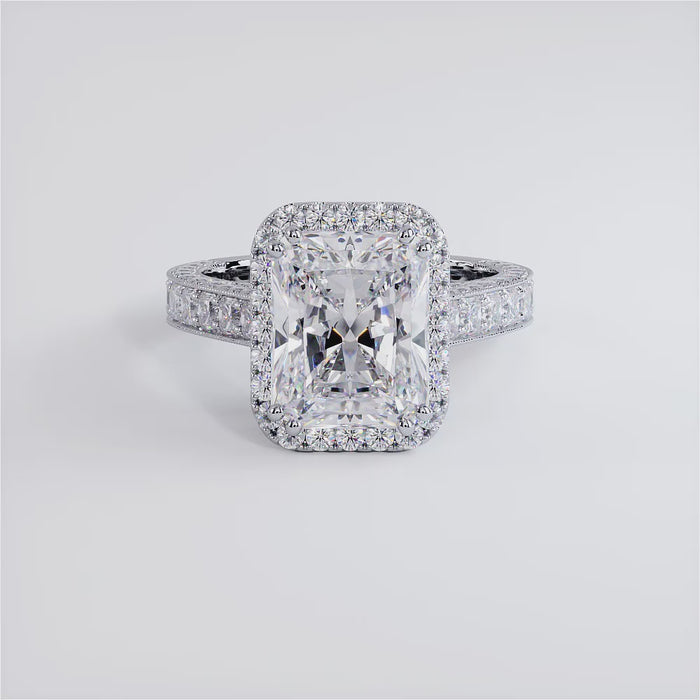 5.89ctw GIA Certified E-VVS2 Radiant Cut Halo Micropavé Vintage Style Lab Grown Diamond Engagement Ring set in 14k White Gold
