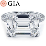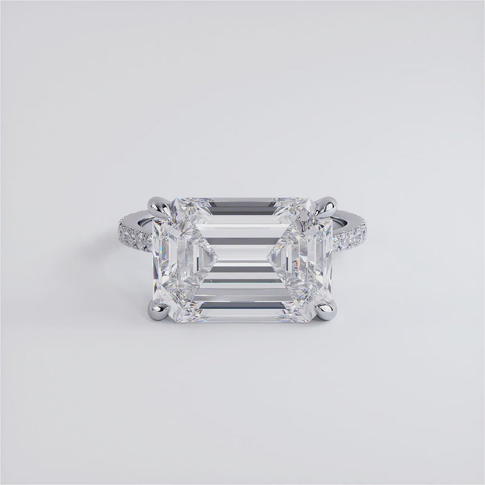 A petite East to West micropavé diamond engagement ring set with 5.00 Carat Emerald Cut Lab Grown Diamond.
