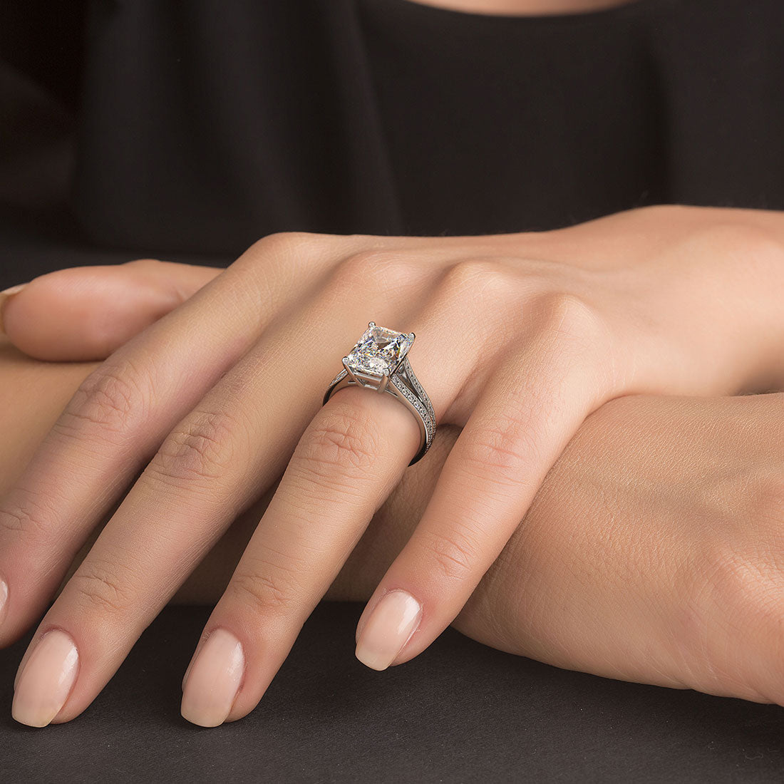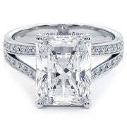 A micropavé split shank diamond engagement ring set with 5.00ct dew Radiant Cut VVS & Colorless (D-E-F) Moissanite.