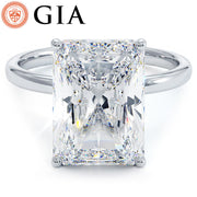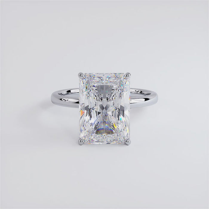 A classic petite wire diamond solitaire engagement ring set with 5 Carat Radiant Cut Lab Grown Diamond.