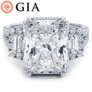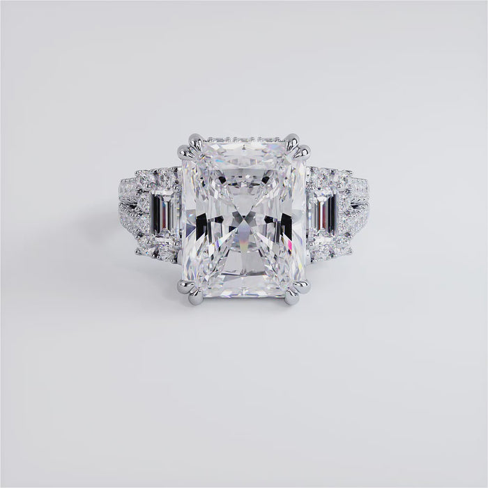 A three stone micropavé split shank diamond engagement ring set with 5 Carat Radiant Cut Lab Grown Diamond.