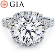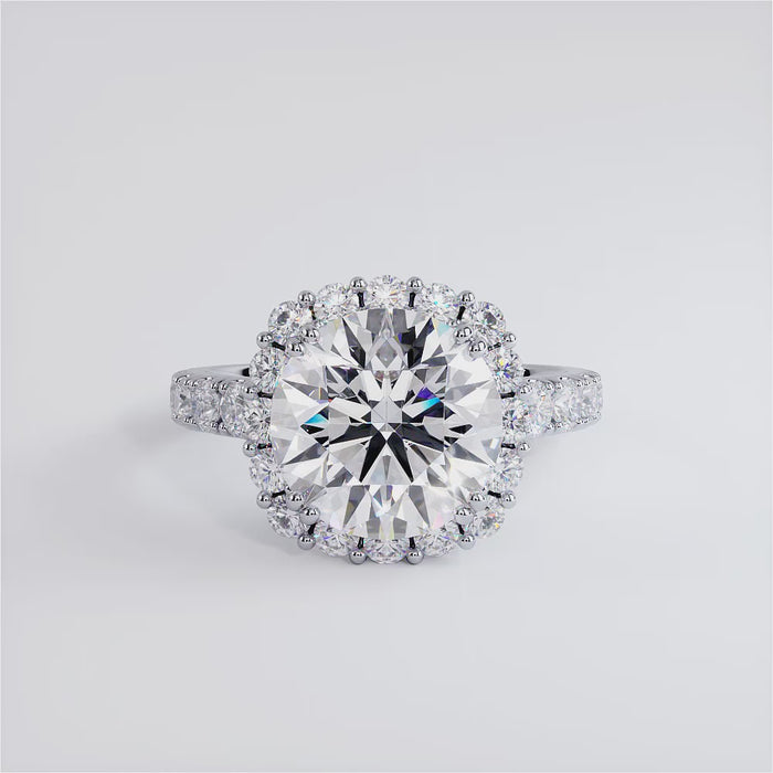 A vintage style micro prong set halo diamond engagement ring set with 5 Carat Round Cut Lab Grown Diamond.