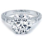 A tapered baguette & round brilliant three Stone Micropavé diamond engagement ring set with 5.00ct dew Round Cut VVS & Colorless (D-E-F) Moissanite.