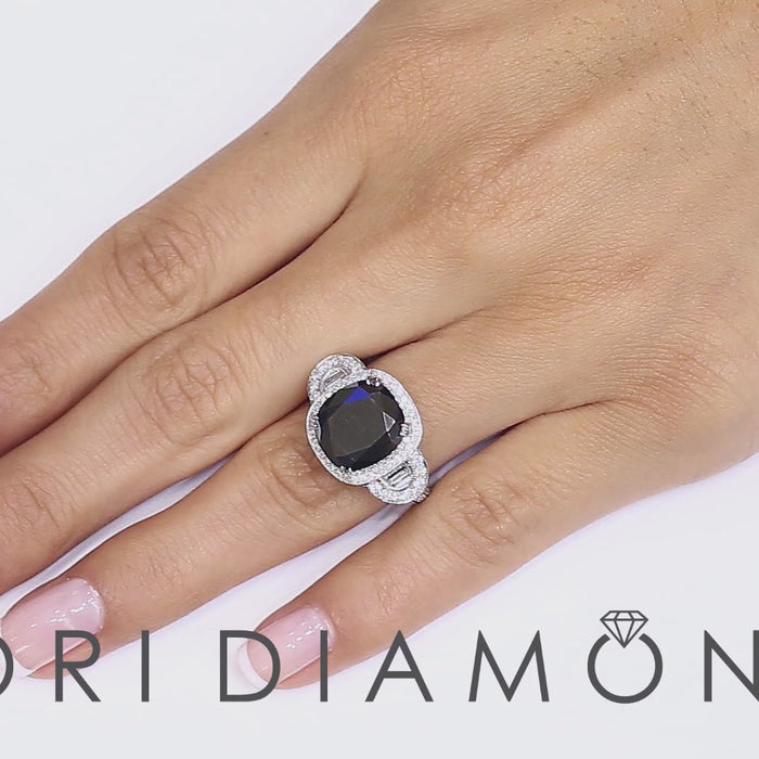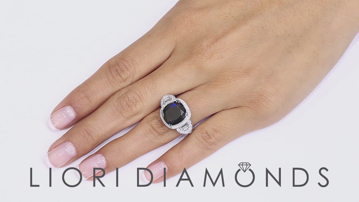 This magnificent ring is perfectly centered with a 4.94ctw Fancy Black Diamond. The cushion cut diamond is properly secured by 4 doubled prongs. A total of 1.14cts of F-VS Baguette & Round brilliant diamonds beautifully decorate the intricate ring. The vintage chic setting is made in 14k white gold.
