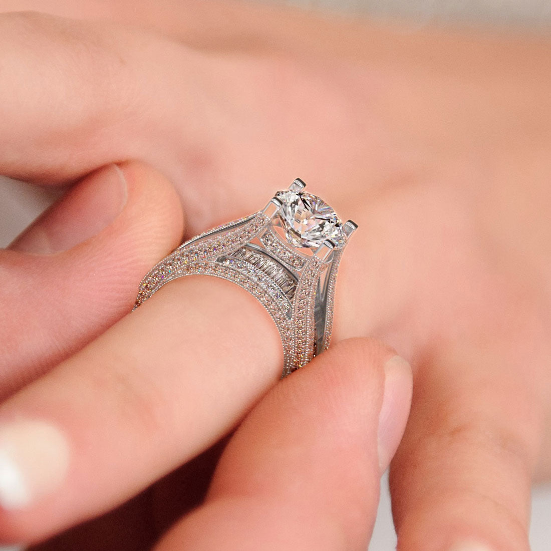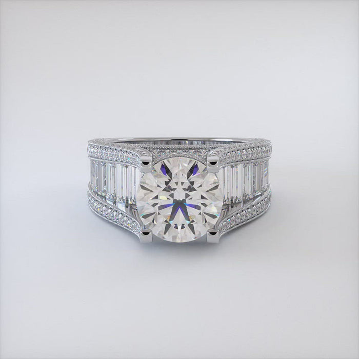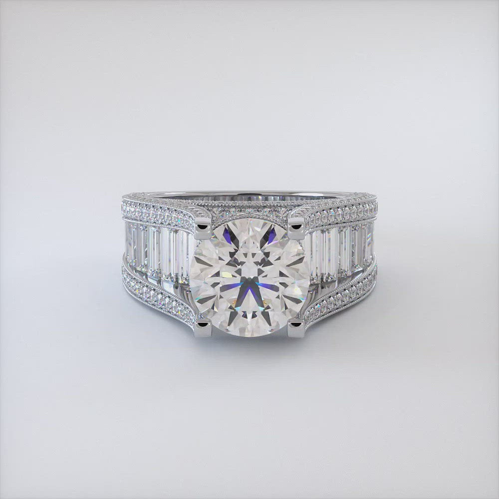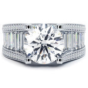 This perfect masterpiece diamond engagement ring is perfectly set up with a 3.63ctw white round diamond center stone and 2.91ctw of gorgeous sides stones. This huge diamond engagement ring is complimented by perfectly set baguette diamonds as well as small round diamonds. This unique diamond engagement ring is casted in 14kt white gold.