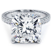 A petite micro prong set diamond engagement ring set with 6.00ct dew Cushion Cut VVS & Colorless (D-E-F) Moissanite.