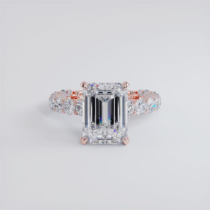 A unique micropavé lucida set diamond engagement ring set with Emerald Cut Lab Grown Diamond.