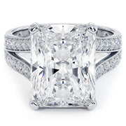 A micropavé split shank diamond engagement ring set with 7.00ct dew Radiant Cut VVS & Colorless (D-E-F) Moissanite.