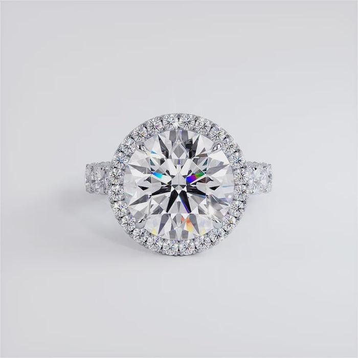 A unique micropavé U shape halo setting diamond engagement ring masterpiece! Set with 7.01 Carat Round Cut Lab Grown Diamond.