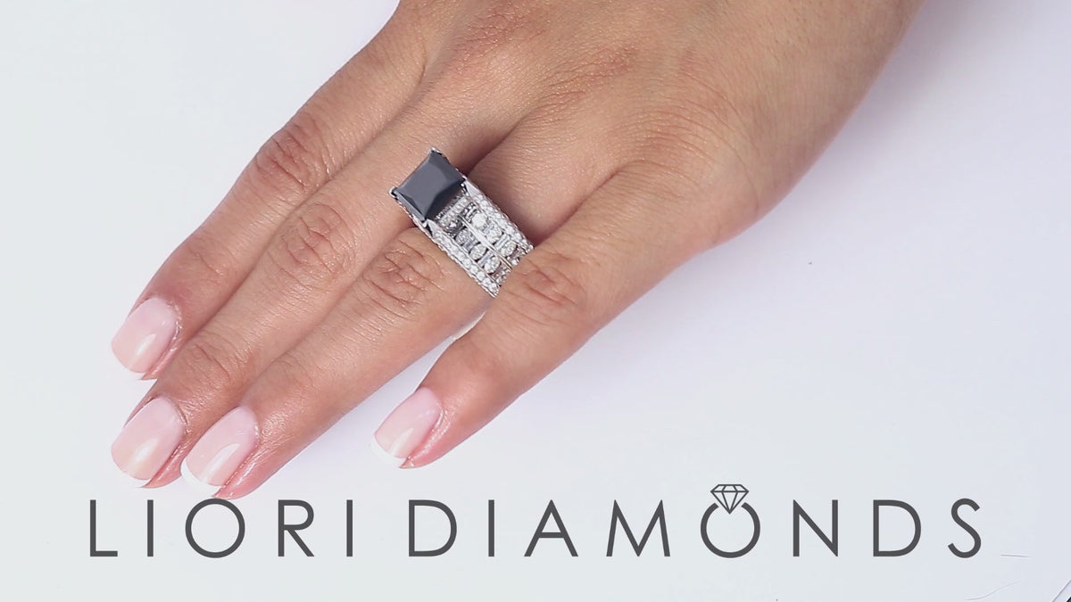 This elegant big princess cut black diamond engagement ring is perfectly set up with a 5.05ctw black princess cut diamond center stone and 3.77ctw of gorgeous round, marques and baguette side stones. This unique diamond engagement ring is complimented by small round diamonds on the prongs leading up to the main black diamond. This pretty diamond engagement ring is casted in 14kt white gold. This elegant black diamond ring is in a class of it's own. The main stone shows no visible imperfections as it is AAA quality. This is the perfect diamond engagement ring for someone who is in quest of a flashy black diamond engagement ring