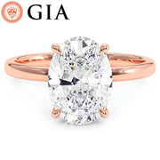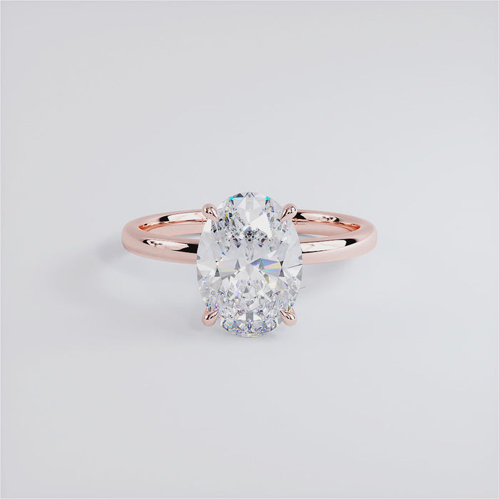 A classic petite wire diamond solitaire engagement ring set with 3 Carat Oval Cut Lab Grown Diamond.