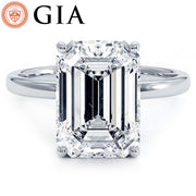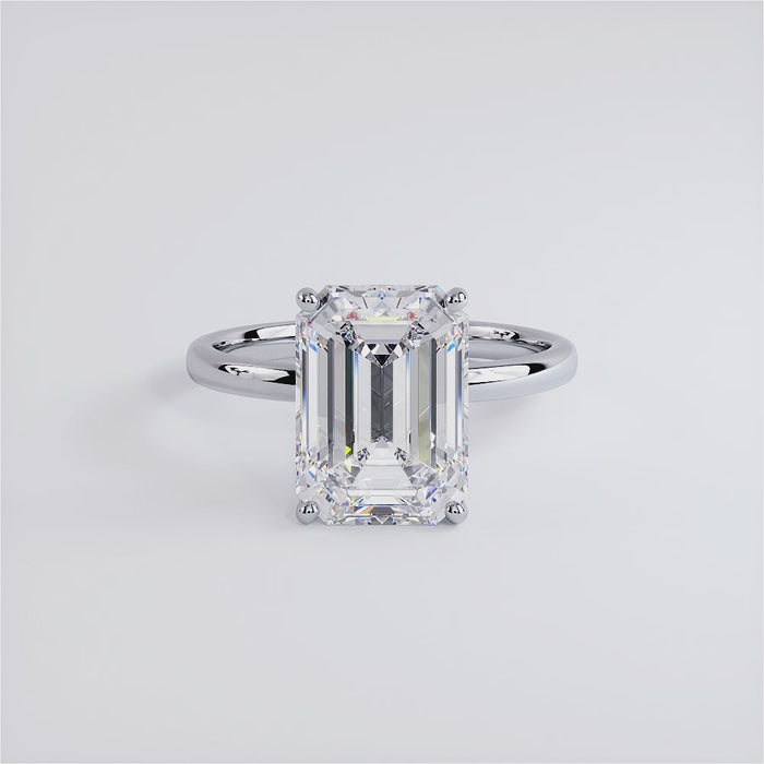 A classic petite wire diamond solitaire engagement ring set with 4 Carat Emerald Cut Lab Grown Diamond.