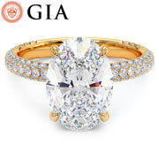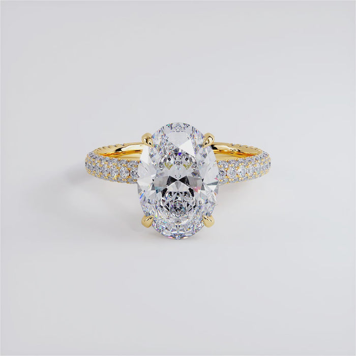A trio micropavé diamond engagement ring set with 4 Carat Oval Cut Lab Grown Diamond.